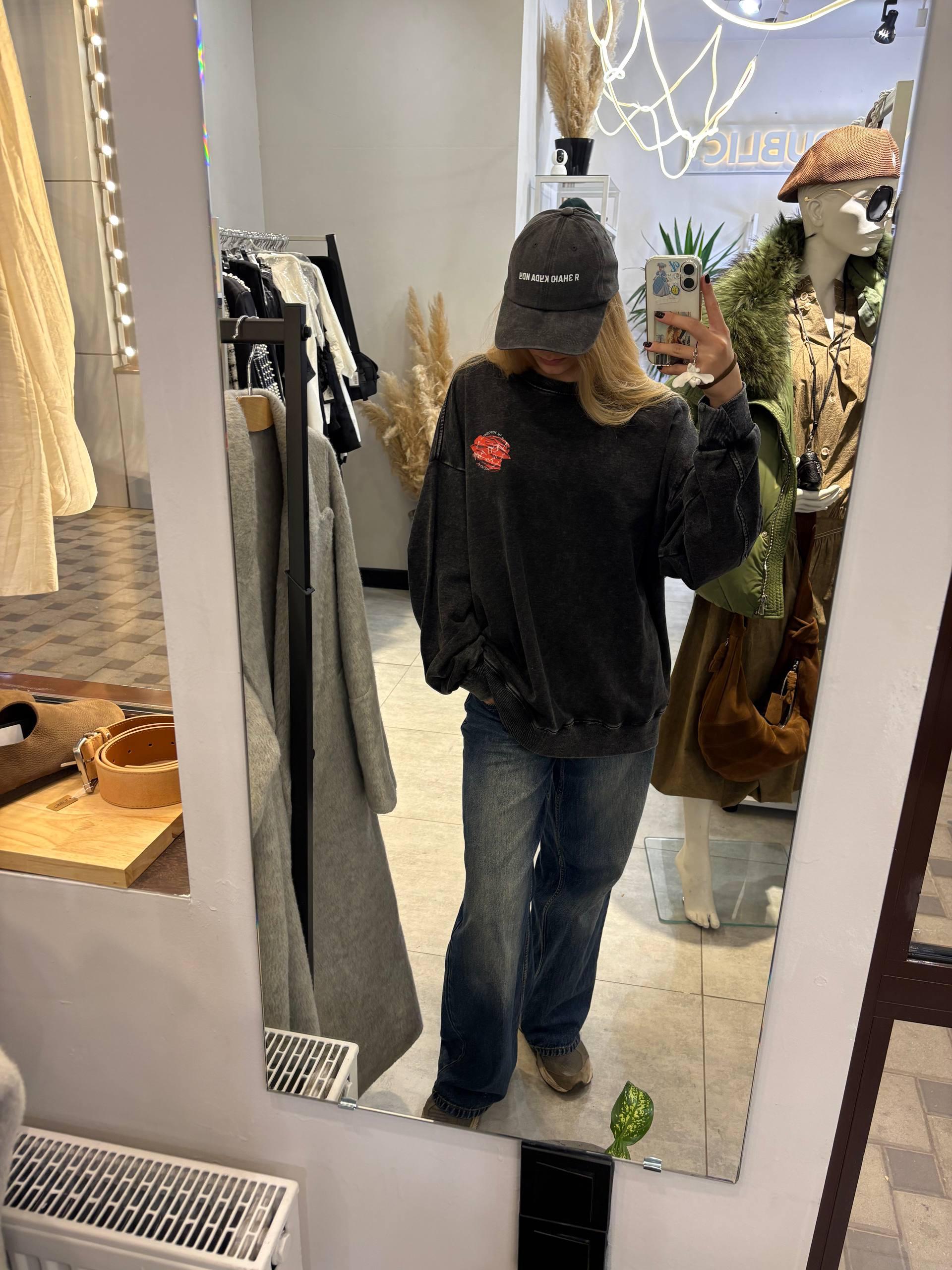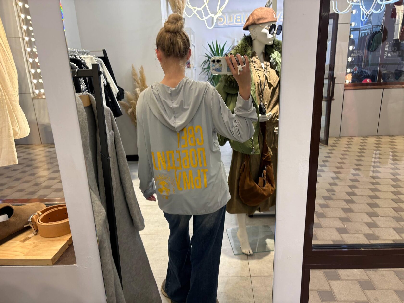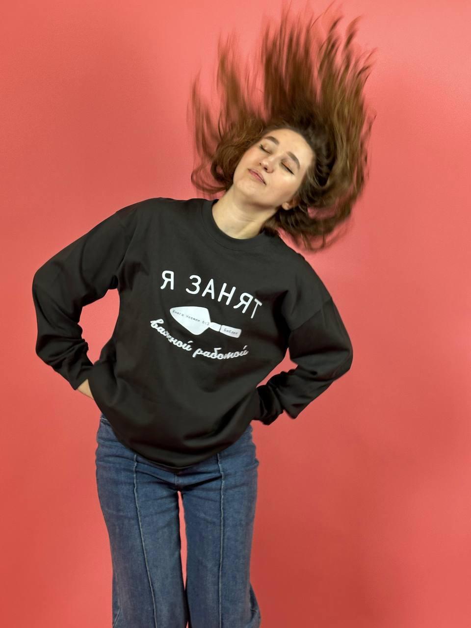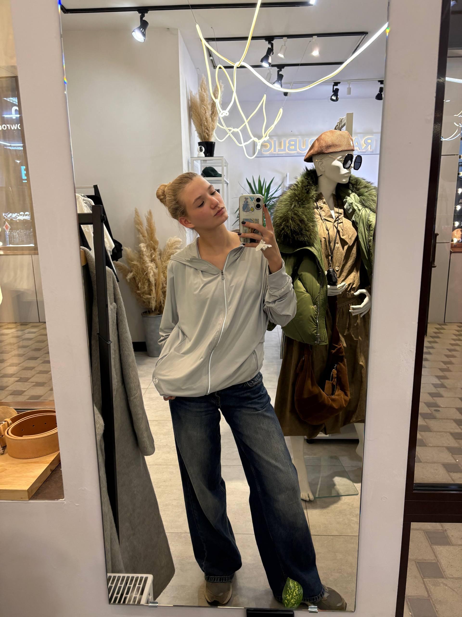 футболка выполнена из жатой ткани. Совсем не требует глажки. Идеальна к телу. Эту коллекцию носят мужчины и женщины. Можно пробовать на М размер, если красиво ее застилизовать с жакетом или завязать узлом, так как маленьких размеров их нет.